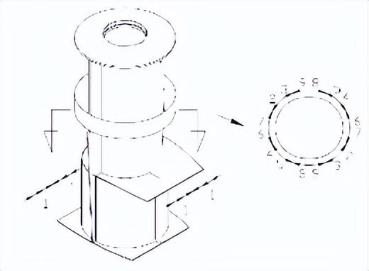 5.舵套筒定位:根據軸系望光儀確定的舵系中心線確定舵線的上下基準點,舵系上基準點應在舵機室內,下基準點在塢底。確定舵系上下基準點時要同時考慮軸舵系不相交值,綜合考慮后將舵隧找正定位。在焊接過程中用鋼絲拉線輔助監測焊接變形量。