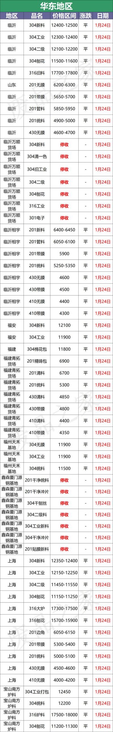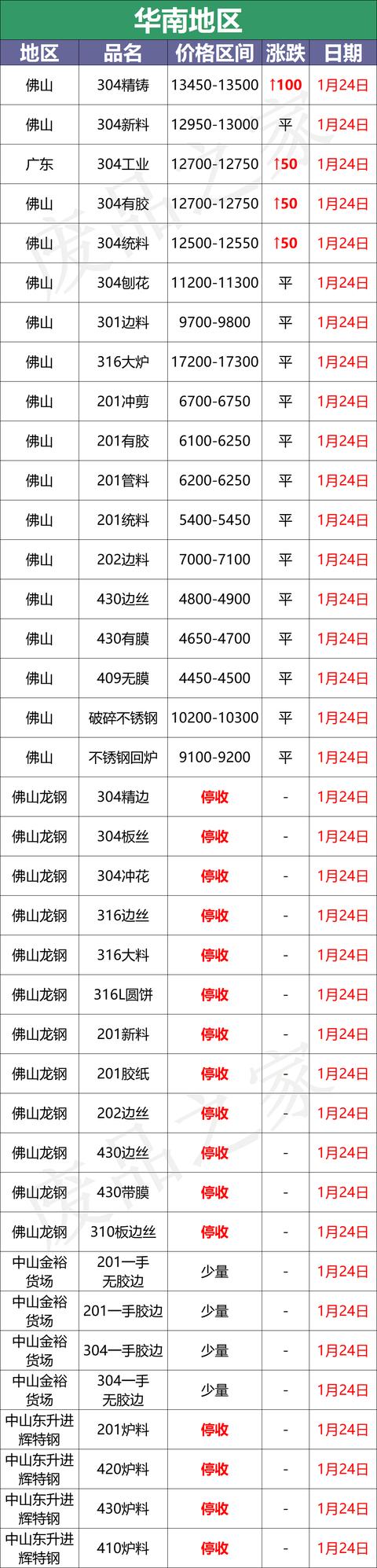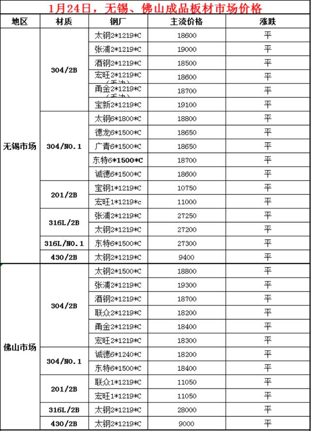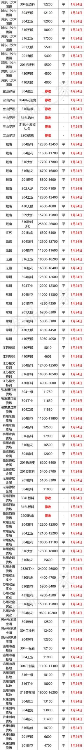 1月24日,商家陸續放假,價格保持不變,個別堅挺。華南市場佛山方面,304中頻12950-13000,統料12500-12550,部分漲50,201沖剪料6700-6750,統料5400-5450,華北市場保定方面,304新料12600-12700不變,佛山304新料12950-13000,佛山304統料12500-12550,戴南304一級12350-12450,上海304一級12350-12400,溫州304工業11800-11900,佛山201新料6700-6750,佛山201混打5400-5450,節前多走穩。