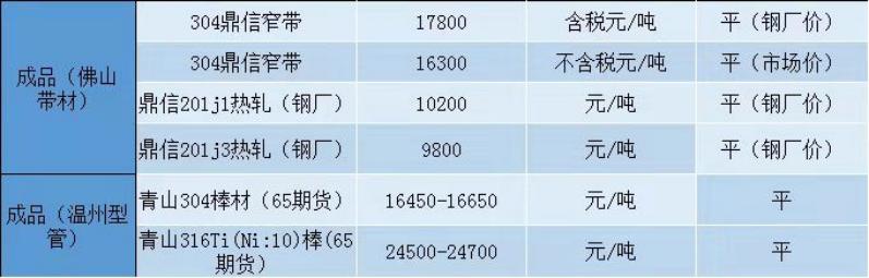 佛山304新材料13000-13050、佛山304普通材料12500-12550、戴南304一級12350-12450、上海304一級12350-12400、溫州304工業11800-11900、佛山201新材料6700-6750佛山201混戰5400-5450。