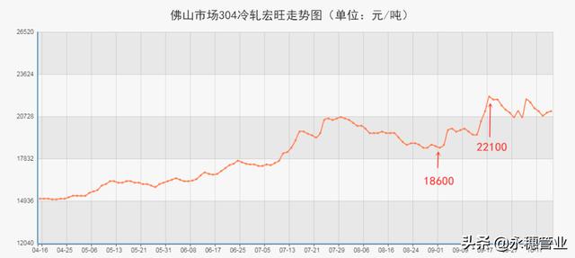9月開始,在“能耗雙控+限電限產”暴漲套餐下,不銹鋼價格一騎絕塵,以佛山市場304冷軋宏旺為例,市場報價從18600元/噸飆漲3500元/噸至22100元/噸。