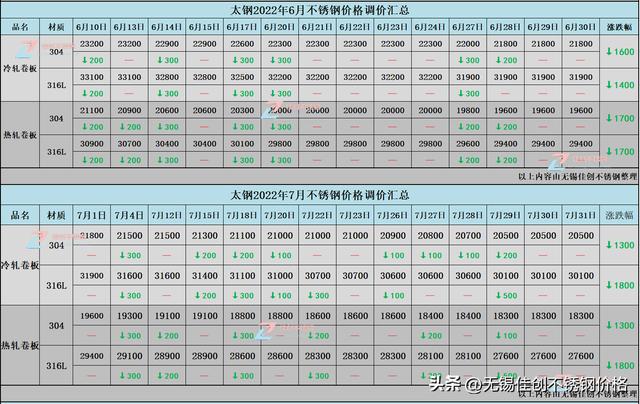 7月全月太鋼冷軋304不銹鋼價格跌1300元;冷軋316L不銹鋼價格跌1800元;熱軋304不銹鋼價格跌1300元;熱軋316L不銹鋼價格跌1800元。